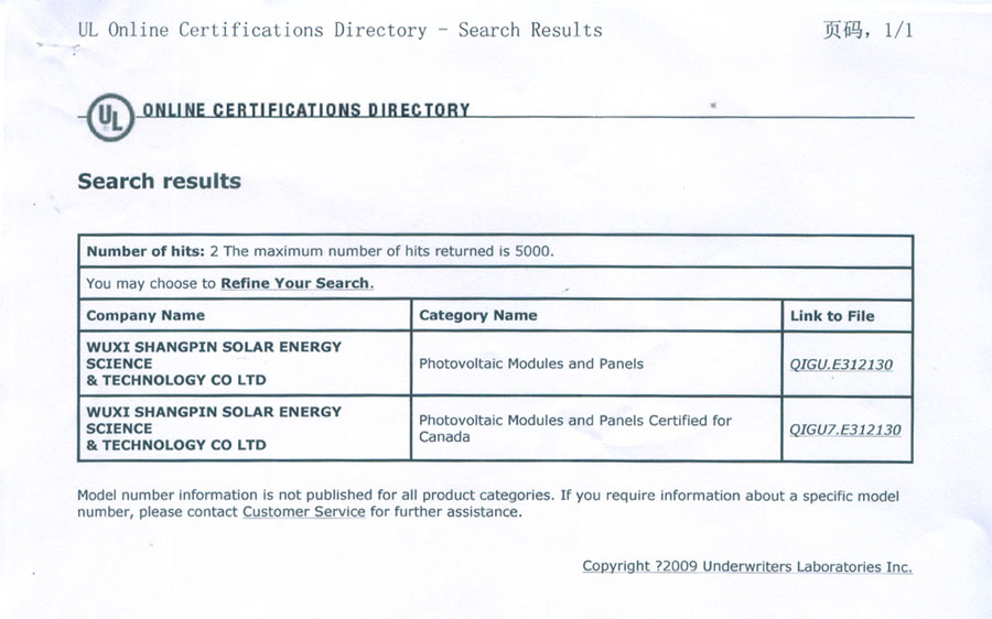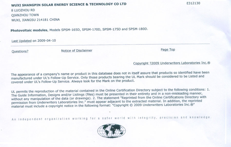 We got the news from UL that we have passed the UL tests and have ability to get the UL certificate in April, 2009. That means we can promote our PV products in the US market which is helpful for Wuxi Shangpin Solar to develop the US market.