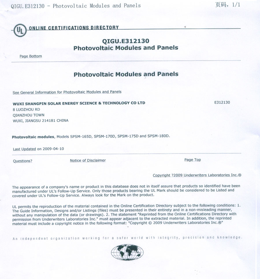 The type included in the UL certificate is SPSM-165D¡¢SPSM-170D¡¢SPSM-175D¡¢SPSM-180D. Meanwhile, the TUV and CE certificates for the high power solar modules of both mono and poly (within 280w) will be expected to get until August in 2009.